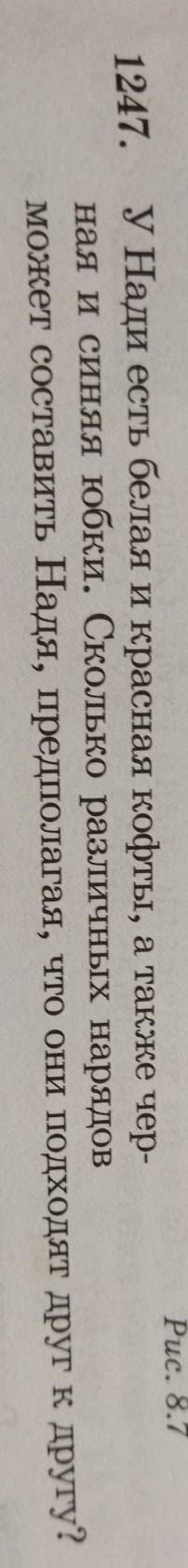 1247. Нади есть белая и красная кофты, а также чер- ная и синяя юбки. Сколько различных нарядов может составить Надя, предполагая, что они подходят друг к другу?