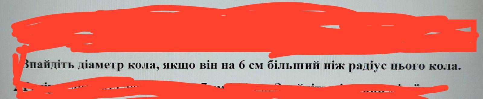 Мислимо логічно: Діаметр це лінія що з'єднує дві будь які точки кола, і при цьому проходить через точку середини кола. А радіус це лінія від центра кола до будь–якої точки кола. Діаметр - це Два радіуси. Отже, якщо Діаметр більший ніж радіус на 6 см - Діаметр = 12 см.