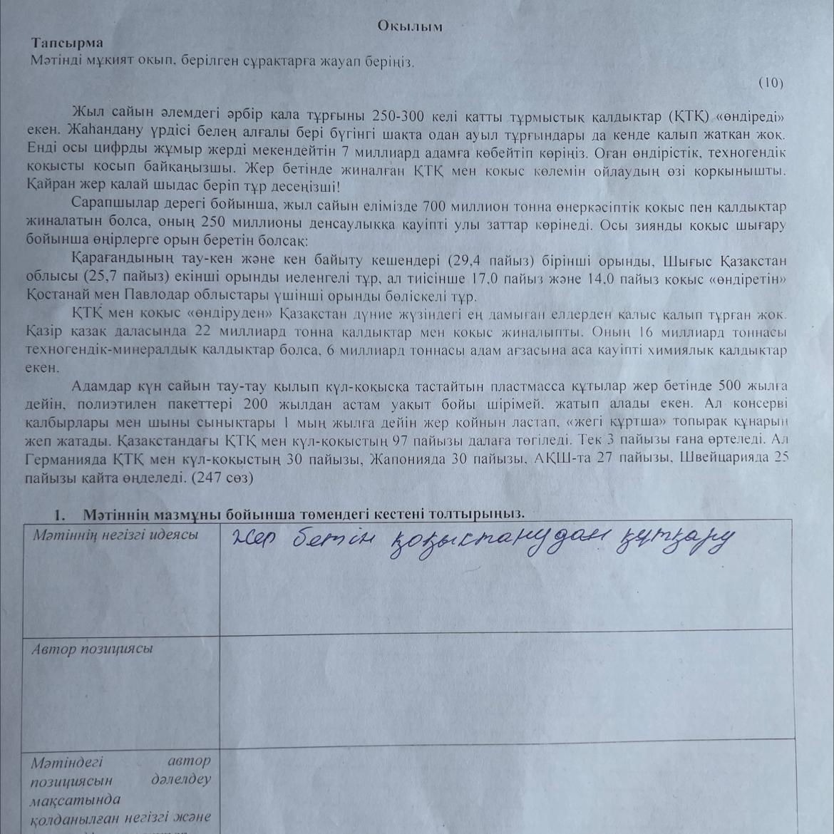 1. Мәтіннің мазмұны бойынша төмендегi кестені толтырыныз.