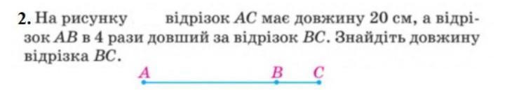 На рисунку відрізок АС має довжину 20 см, а відрізок АВ в 4 рази довший за відрізок ВС. Знайдіть довжину