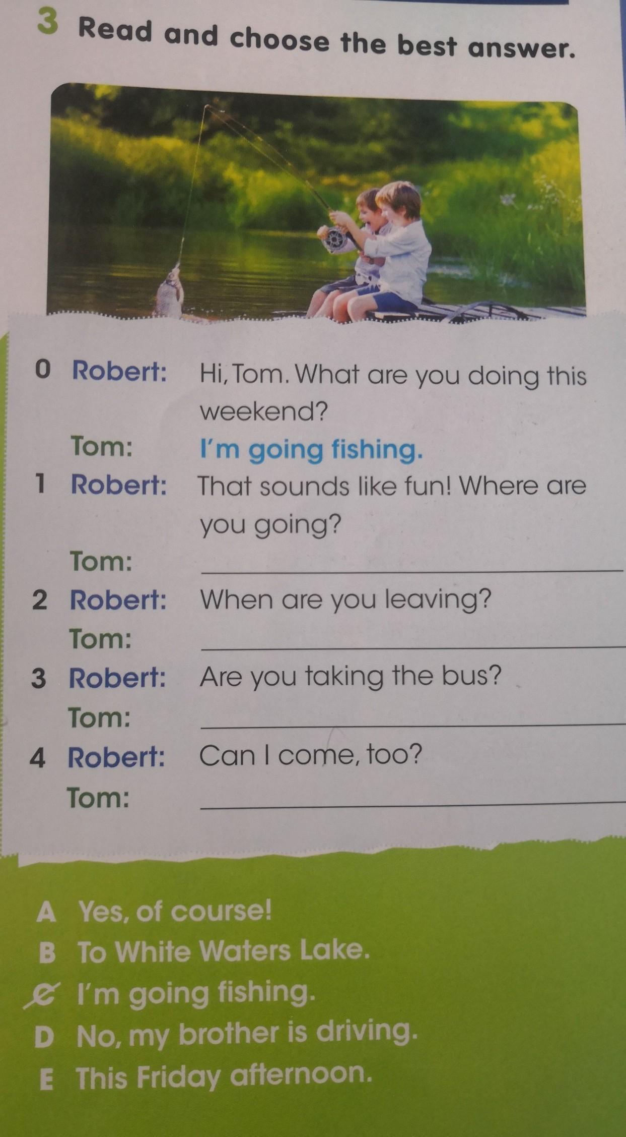 I'm going fishing. 1 Robert: That sounds like fun! Where are you going?