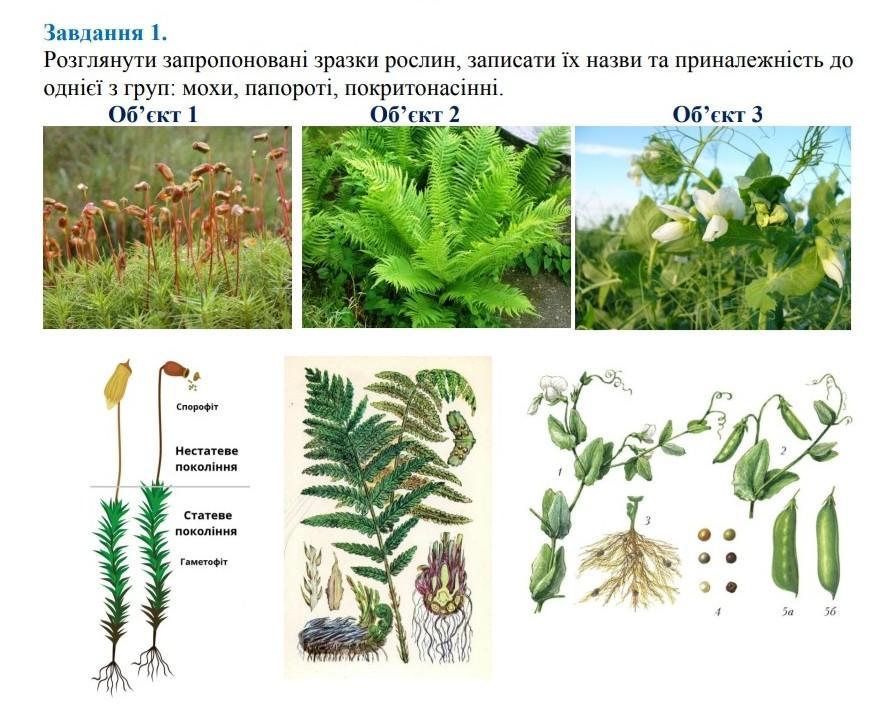 Розглянути запропоновані зразки рослин, записати їх назви та приналежність до однієї з груп: мохи, папороті, покритонасінні. Об'єкт 1 Об'єкт 2 Об'єкт 3 Спорофіт Нестатеве ПОКОЛІННЯ Статеве ПОКОЛІННЯ Гаметофіт Sa 56