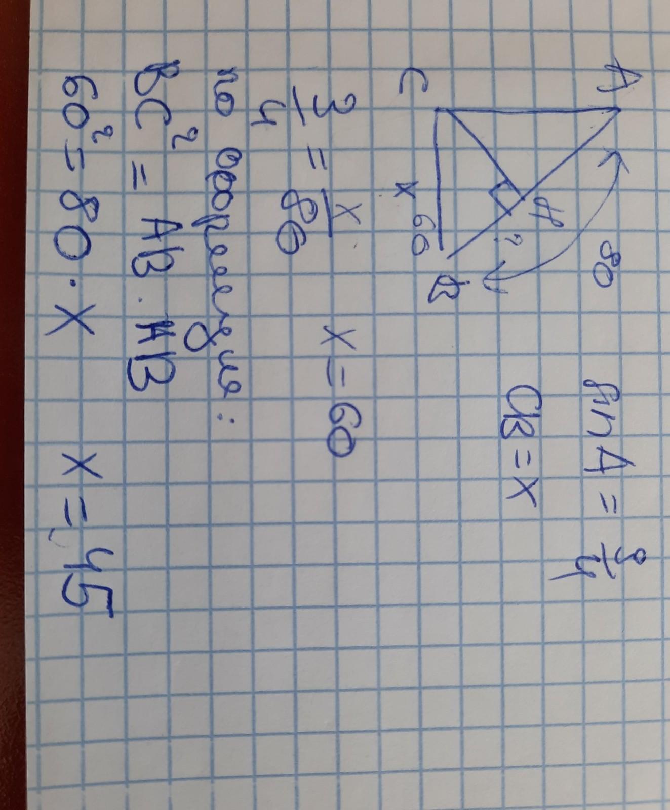 В треугольнике ABC угол C равен 90°, CH — высота, AB = 80, синус A = 0,75. Найдите длину отрезка BH.
