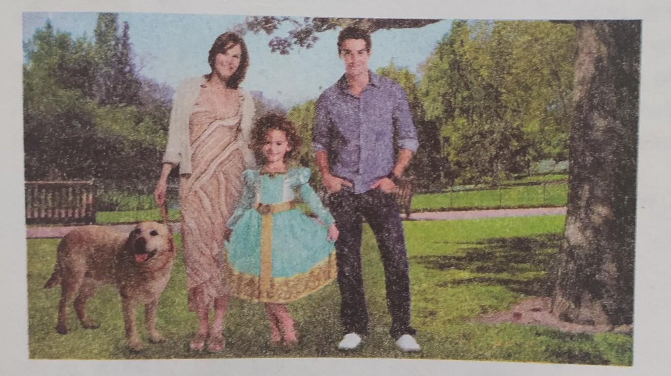 Das Foto zeigt eine Familie: Mädchen, Papa, Mama, Hund.
