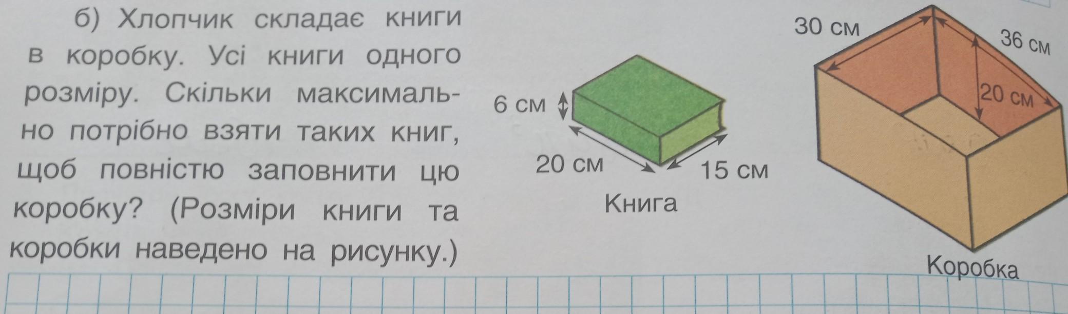 б) Хлопчик складає книги в коробку. Усі книги одного розміру. Скільки максимально потрібно взяти таких книг щоб повністю заповнити цю коробку? (Розміри книги коробки наведено на рисунку.) фото в низу очень надо до 18:00