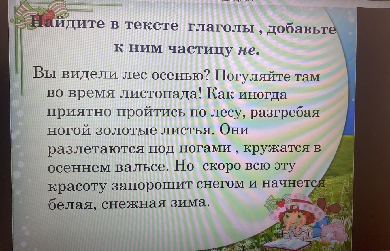 Найдите в тексте глаголы , добавьте к ним частицу не. Вы видели лес осенью? Погуляйте там во время листопада! Как иногда приятно пройтись по лесу, разгребая ногой золотые листья. Они разлетаются под ногами, кружатся в осеннем вальсе. Но скоро всю эту красоту запорошит снегом и начнется белая, снежная зима. ПОМОГИТЕ ТАМ 100 БАЛЛОВ