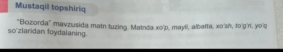 Barno bozorda xarhil mevalar sotayotgan rastaga borib,sotuvchidan qulupnay nechi pul turishini so'radi.Sotuvchi esa xushmuomalalik bilan qulupnay narxining qanchaligini aytib, unda olma yo'q ekanligini to'gridan-toĝri Barnoga aytdi.Barno ham samimiy ohangda mayli,keyingi rastani ko'raychi deb ketmoqchi bo'lgan edi,sotuvchi unga xo'sh mayli,albatta yana xboshqa xaridlar uchun mening rastamga kelib turing deb kuzatib qoydi. Barno esa jilmayib,albatta dedi