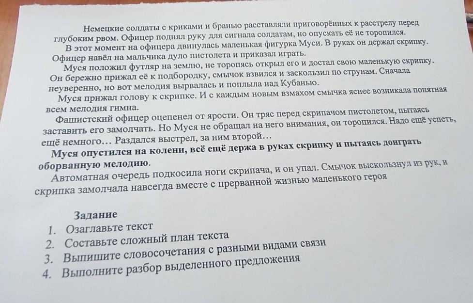Немецкие солдаты с криками и бранью расставляли приговорённых к расстрелу перед глубоким рвом. Офицер поднял руку для сигнала солдатам, но опускать её не торопился. В этот момент на офицера двинулась маленькая фигурка Муси. В руках он держал скрипку. Офицер навёл на мальчика дуло пистолета и приказал играть. Муся положил футляр на землю, не торопясь открыл его и достал свою маленькую скрипку. Он бережно прижал её к подбородку, смычок взвился и заскользил по струнам. Сначала неуверенно, но вот мелодия вырвалась и поплыла над Кубанью. Муся прижал голову к скрипке. И с каждым новым взмахом смычка яснее возникала понятная всем мелодия гимна. Фашистский офицер оцепенел от ярости. Он тряс перед скрипачом пистолетом, пытаясь заставить его замолчать. Но Муся не обращал на него внимания, он торопился. Надо ещё успеть, ещё немного... Раздался выстрел, за ним второй... Муся опустился на колени, всё ещё держа в руках скрипку и пытаясь доиграть оборванную мелодию. Автоматная очередь подкосила ноги скрипача, и он упал. Смычок выскользнул из рук, и скрипка замолчала навсегда вместе с прерванной жизнью маленького героя Задание 1. Озаглавьте текст 2. Составьте сложный план текста 3. Выпишите словосочетания с разными видами связи 4. Выполните разбор выделенного предложения