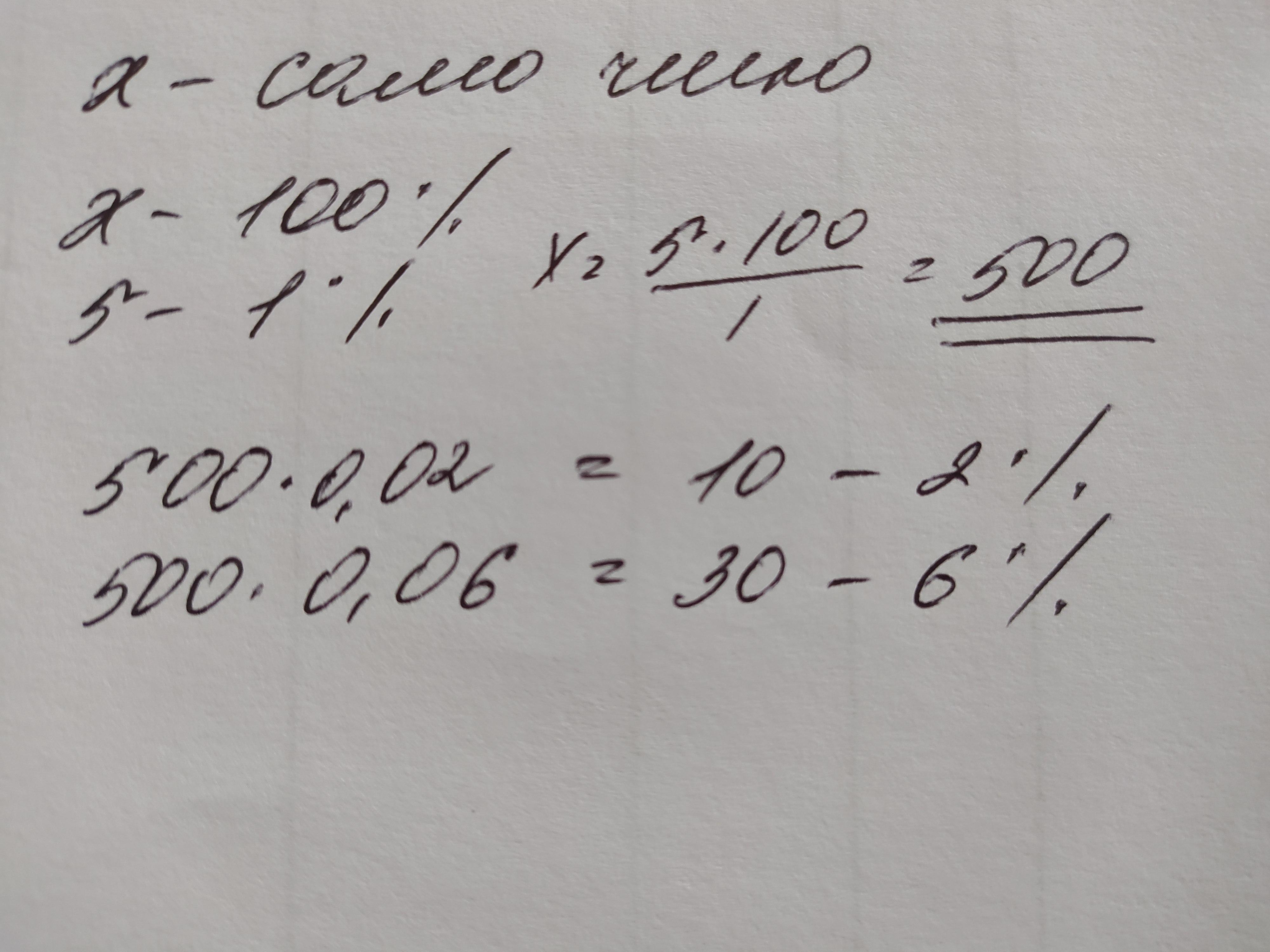 Ответ: смотри если 1% числа равен пяти то получается должно быть какое число 1% от 5 это будет это будет пять Да ну тогда получается 2% будут равно 10 а 6% будет 30 кажется