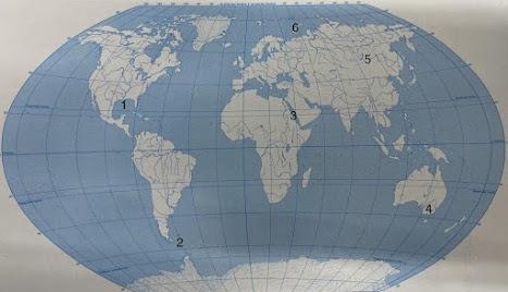 Запишіть назви географічних об'єктів, які "заховались" під цифрами на карті світу. УВАГА!!! Назви потрібно записати за порядком, від 1 по 6, через кому. ПІДКАЗКА! 1 - затока, 2 - протока, 3 - море, 4 - річка, 5 - озеро, 6 - острови. Нагадую, що всі географічні назви пишуться з ВЕЛИКОЇ літери СРОЧНО! НАДО ДО 13:15