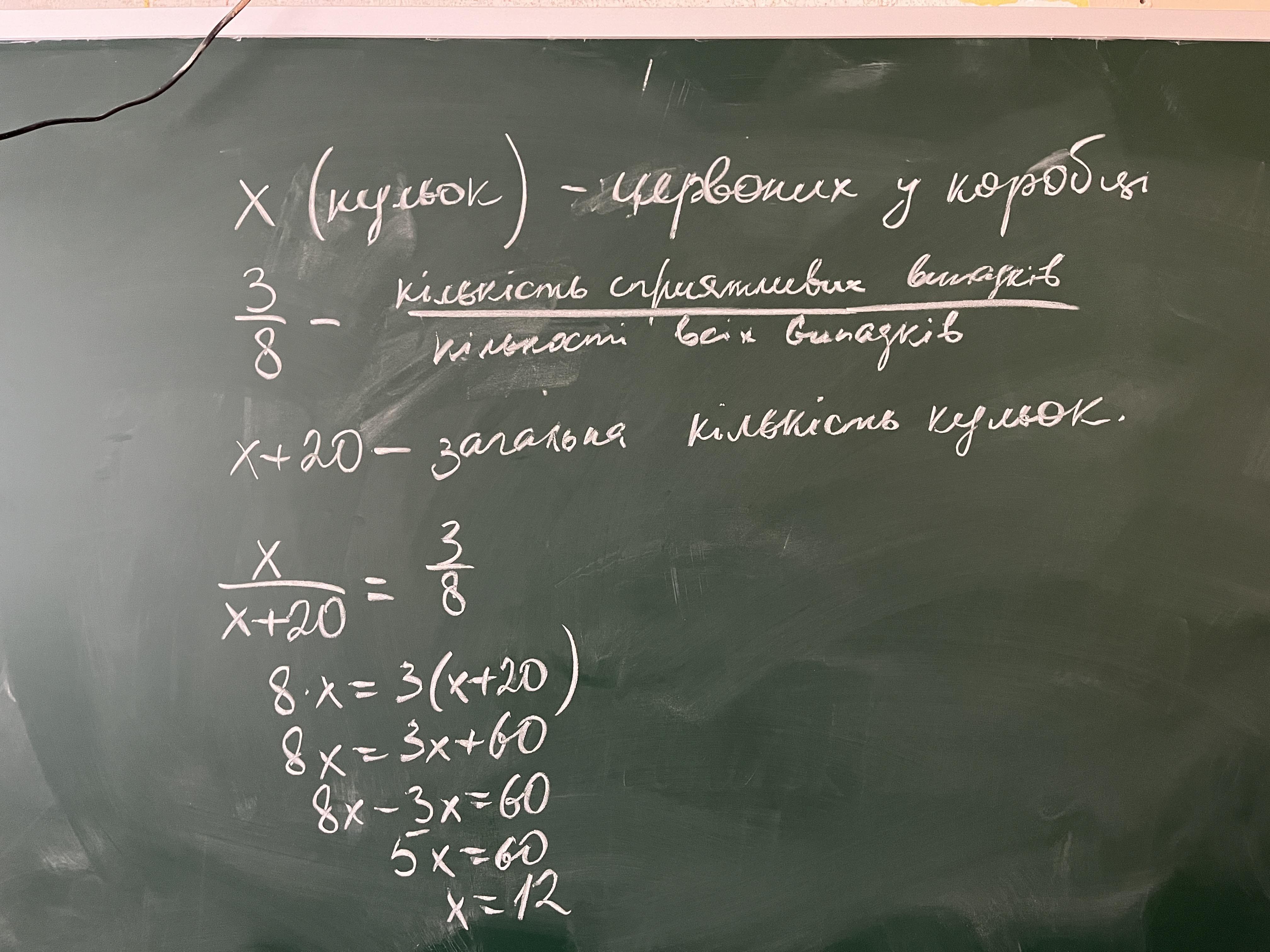 У коробці лежать червоні і жовті кульки. Скільки червоних кульок у коробці, якщо ймовірність вийняти з неї навмання червону кульку дорівнює 3 , а жовтих кульок у коробці 20?