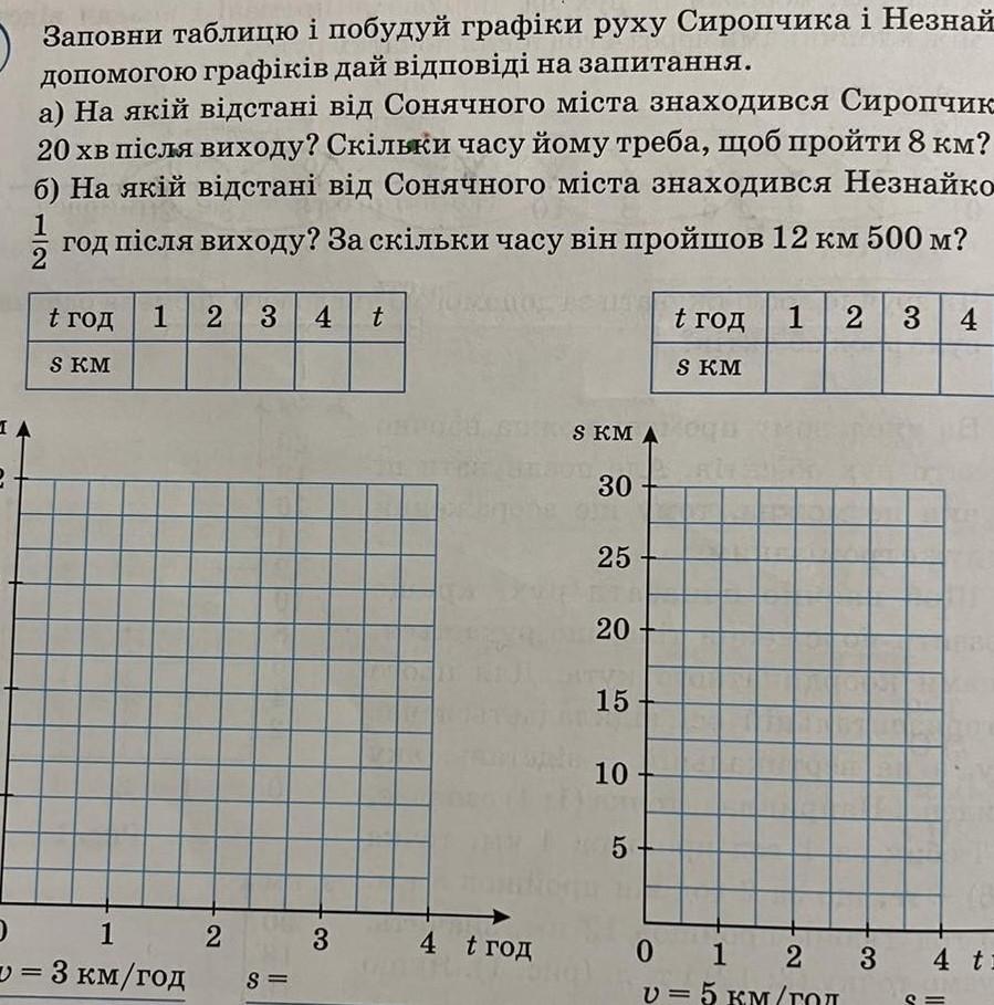 Заповни таблицю і побудуй графіки руху Сиропчика і Не допомогою графіків дай відповіді на запитання. а) На якій відстані від Сонячного міста знаходився Сиро 20 хв після виходу? Скільки часу йому треба, щоб пройти б) На якій відстані від Сонячного міста знаходився Незн год після виходу? За скільки часу він пройшов 12 км 500м