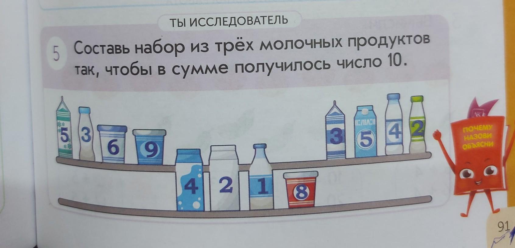 5 Составь набор из трёх молочных продуктов так, чтобы в сумме получилось число 10. 5 3 6 9 4 2 1 8 CAMACH 5 4 2