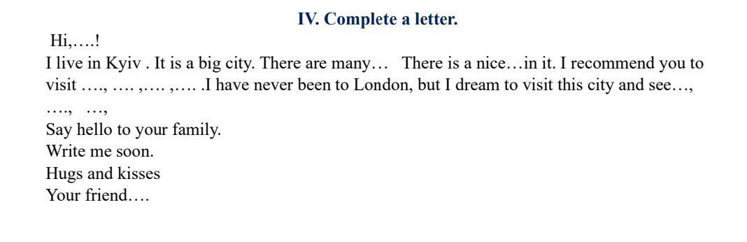 I live in Kyiv. It is a big city. There are many restaurants. There is wonderful food in it. I recommend you to visit Kyivo-Pecherska Lavra, Maidan Nezalezhnosti, The War Memorial Park, Saint Sophia Cathedral, Golden Gates. I have never been to London, but I dream to visit this city and see Big Ben, The river Thames, London Eye.
