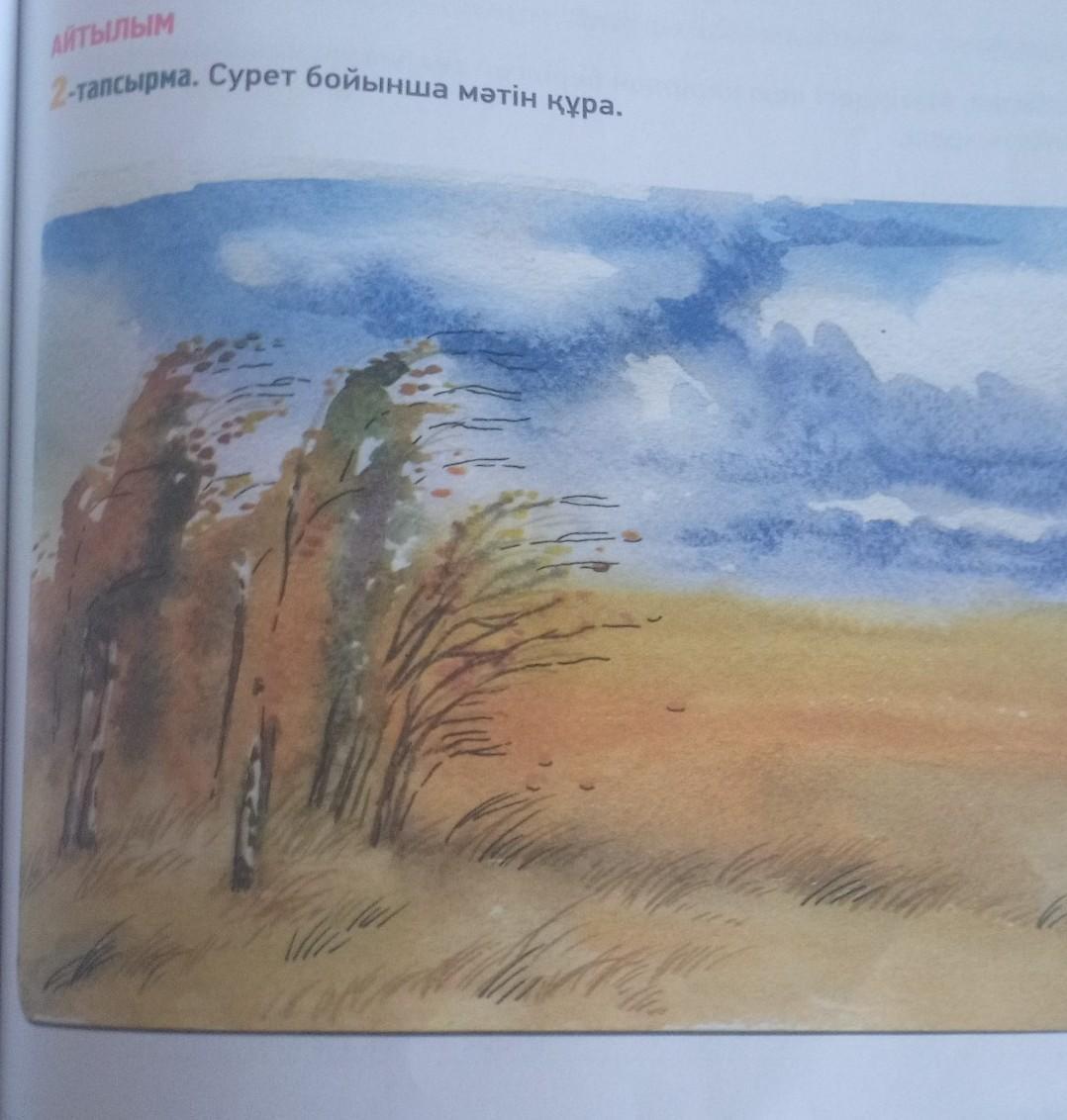 Жаз өтіп күзде келді. Жаз бойы айнала алқызыл гүлге, жер беті көк майса шөпке оранып тұрса бүгін міне, алқап сары желек жамылғандай. Ағаштардың жапырақтары да сарғайып, желмен жерге басын иіп тұр. . Көк аспан көк теңіздей болып тұр.