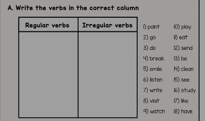 A. Write the verbs in the correct column Regular verbs Irregular verbs 1) paint 2) go 3) do 4) break 5) smile 6) listen 7) write 8) visit 9) watch 10) play 11) eat 12) send 13) be 14) clean 15) see 16) study 17) like 18) have