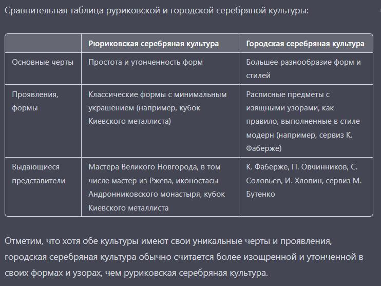Сравнительная таблица руриковской и городской серебряной культуры: