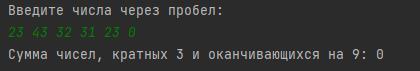print('Сумма чисел, кратных 3 и оканчивающихся на 9:', sum)