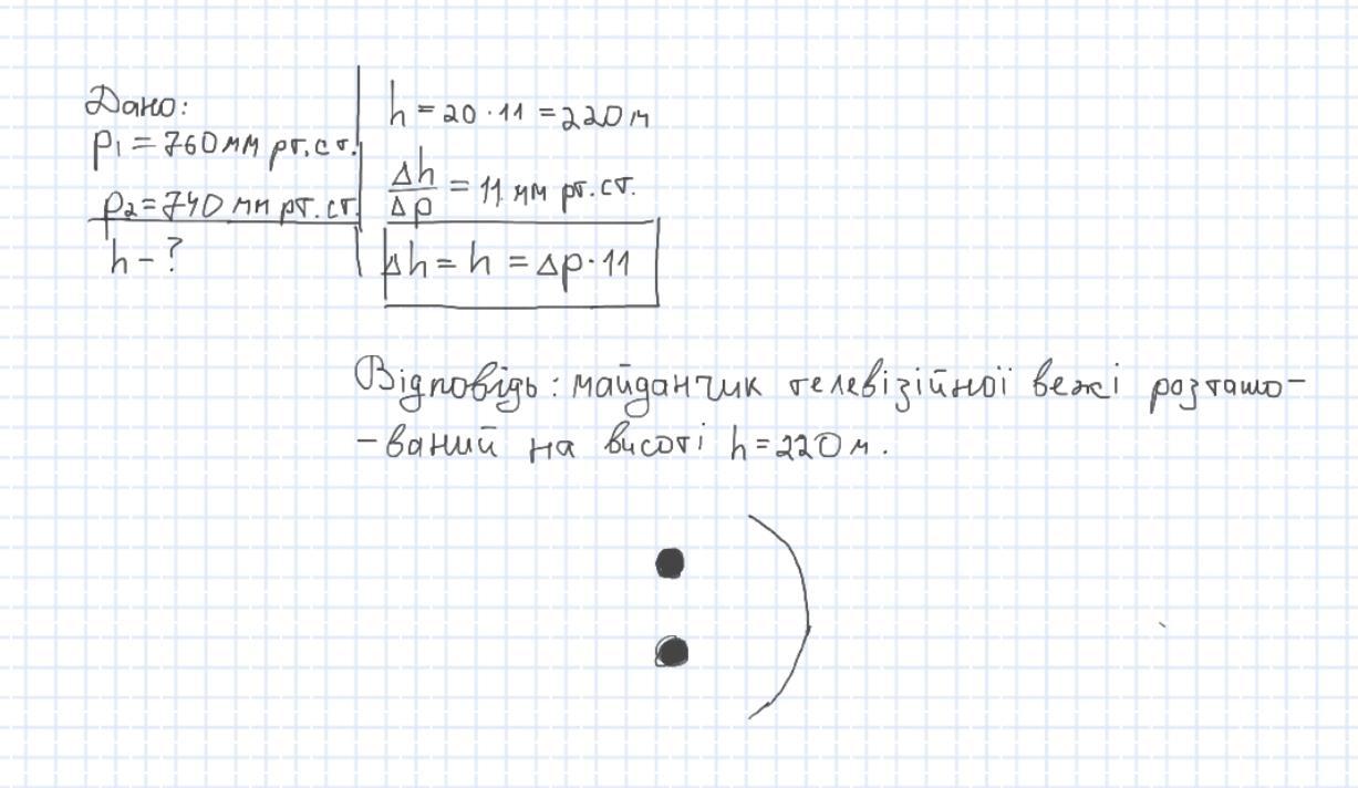 допоможіть будь ласка фізика 7 клас В.Г. Бар'яхтара С.О. Довгого 2015 рік вправа N⁰ 25 (7) на якій висоті розташований оглядовий майданчик телевізійної вежі якщо атмосферний тиск біля підніжжя вежі становить 760 мм рт. ст. а на висоті майданчика 740 мм рт. ст. ДОПОМОЖІТЬ БУДЬ ЛАСКА