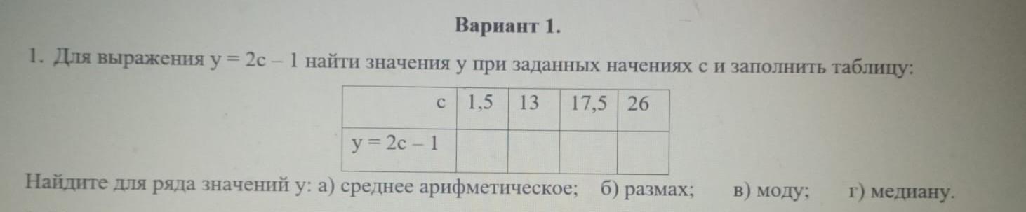 1. Для выражения у = 2с - 1 найти значения у при заданных начениях с и заполнить таблицу: с 1,5 13 17,5 26 y=2c - 1 Найдите для ряда значений у: а) среднее арифметическое; б) размах; в) моду; г) медиану.