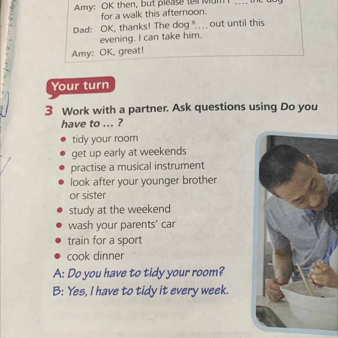 Тут достаточно легко. В задании просят сделать вопросительное предложение и ответ (утверждение). Для первого нам надо поставить Do you have to...(к примеру, get up early at weekends)? В ответе мы ставим Yes, I have (get up early at weekends).