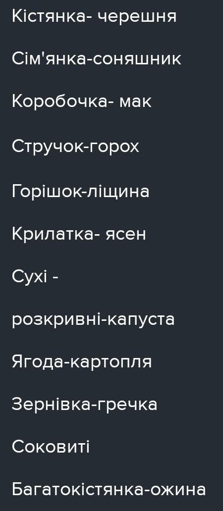 . Установіть відповідність між типами плодів та рослинами яким вони належать