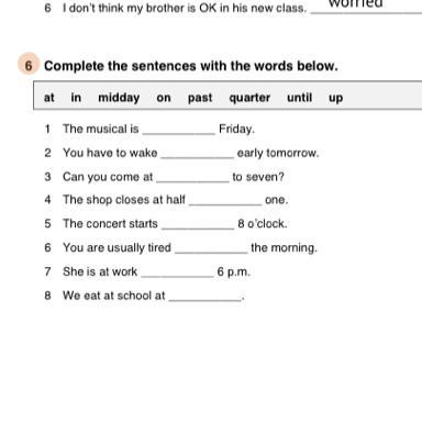 1 on 2. Up 3.quater 4.past 5.at 6.in 7. Until8.midday