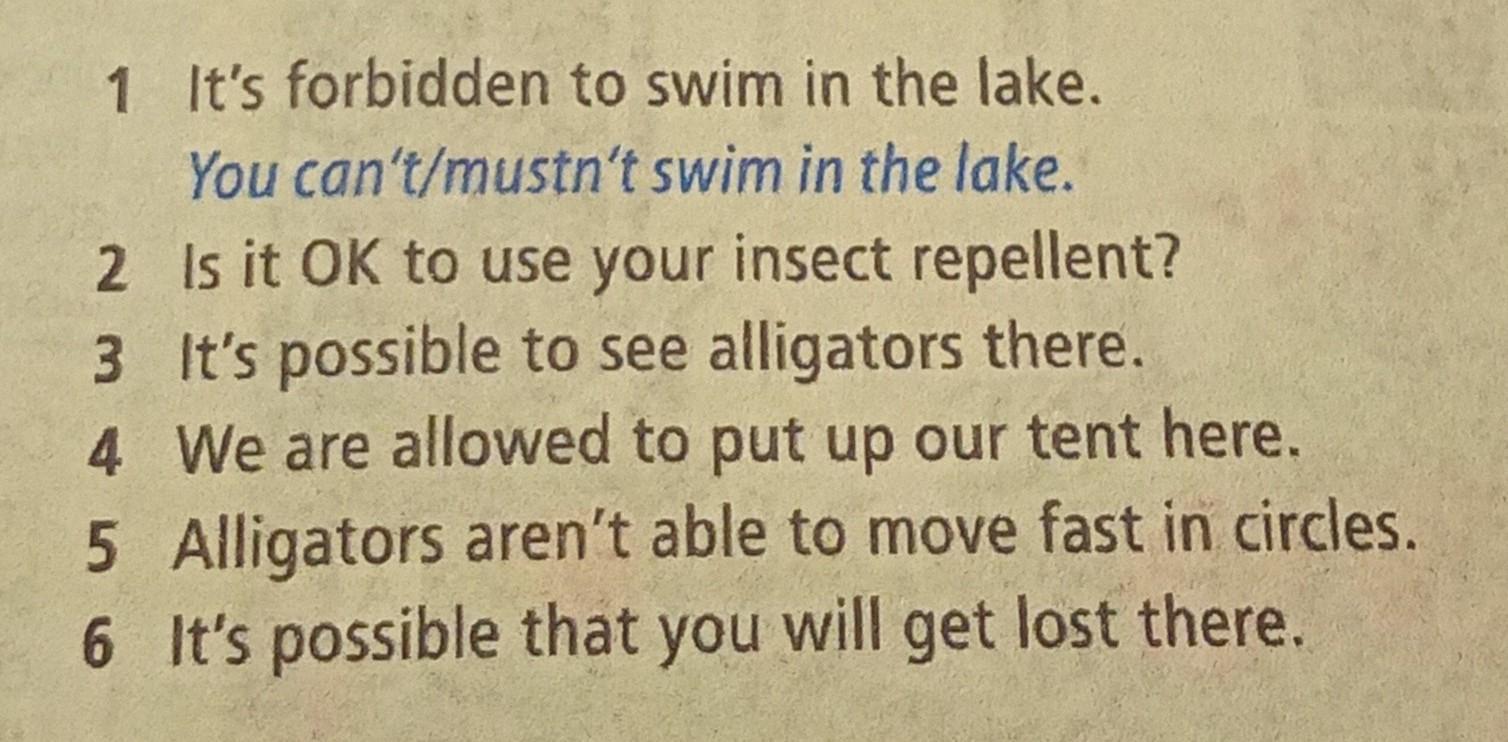 СРОЧНО, ДАЮ 60 БАЛЛОВ, ЗАДАНИЕ:: ПРОЧИТАТЬ ПРИМЕР, ПОТОМ ПЕРЕПИСАТЬ ПРЕДЛОЖЕНИЕ, УПОТРЕБЛЯЯ ПРАВИЛЬНОЕ МОДАЛЬНОЕ СЛОВО (can/can't, must/musn't, и тд)