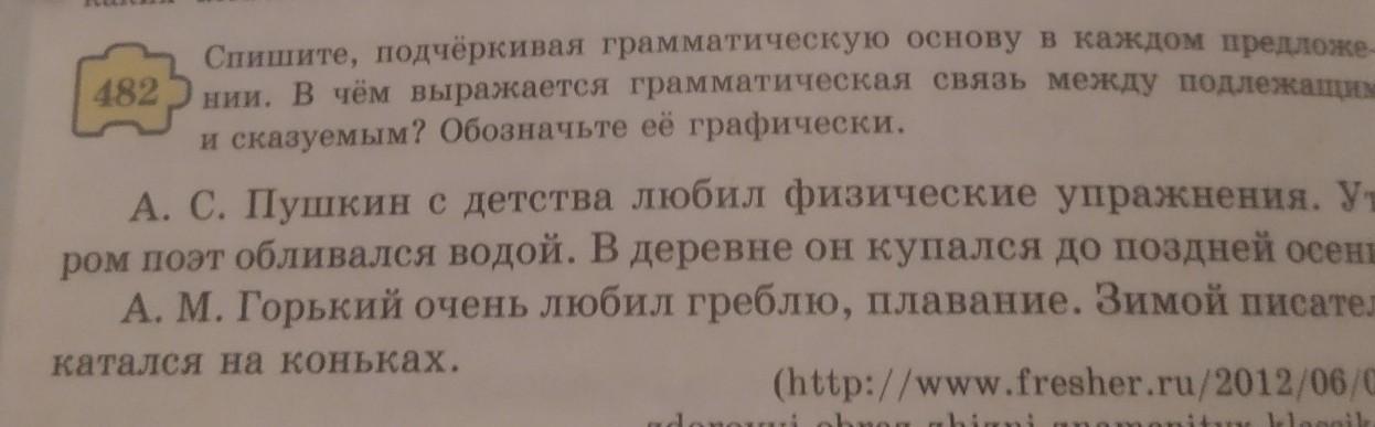 482 Спишите, подчёркивая грамматическую основу в каждом предложе- нии. В чём выражается грамматическая связь между подлежащим и сказуемым? Обозначьте её графически. А. С. Пушкин с детства любил физические упражнения. Ут- ром поэт обливался водой. В деревне он купался до поздней осени. А. М. Горький очень любил греблю, плавание. Зимой писатель катался на коньках. (htt