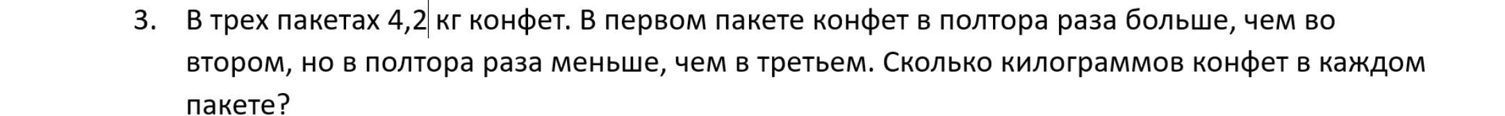 Пусть во 2 пакете х кг тогда в 1 пакете (1,5х) кг тогда в 3 пакете (1,5(1,5) кг х+1,5 х +2,25 =3,8 дальше хз