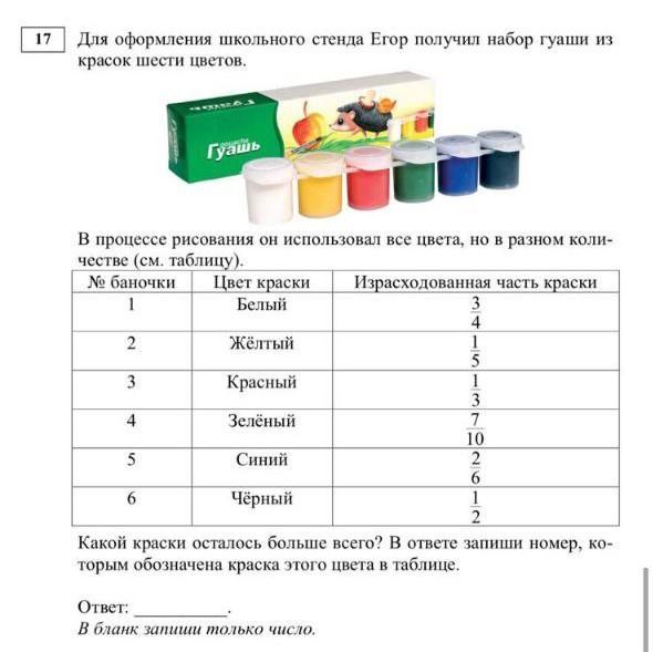для оформления школьного стенда егор получил набор гуаши из красок шести цветов. в процессе рисования он использовал все цвета но в разном количестве (см. таблицу).