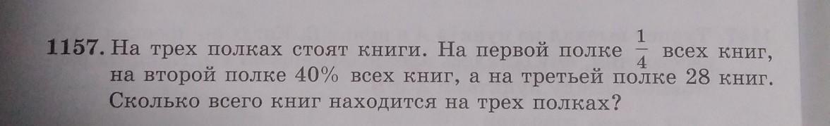 1 4 1157. На трех полках стоят книги. На первой полке всех книг, на второй полке 40% всех книг, а на третьей полке 28 книг. Сколько всего книг находится на трех полках?