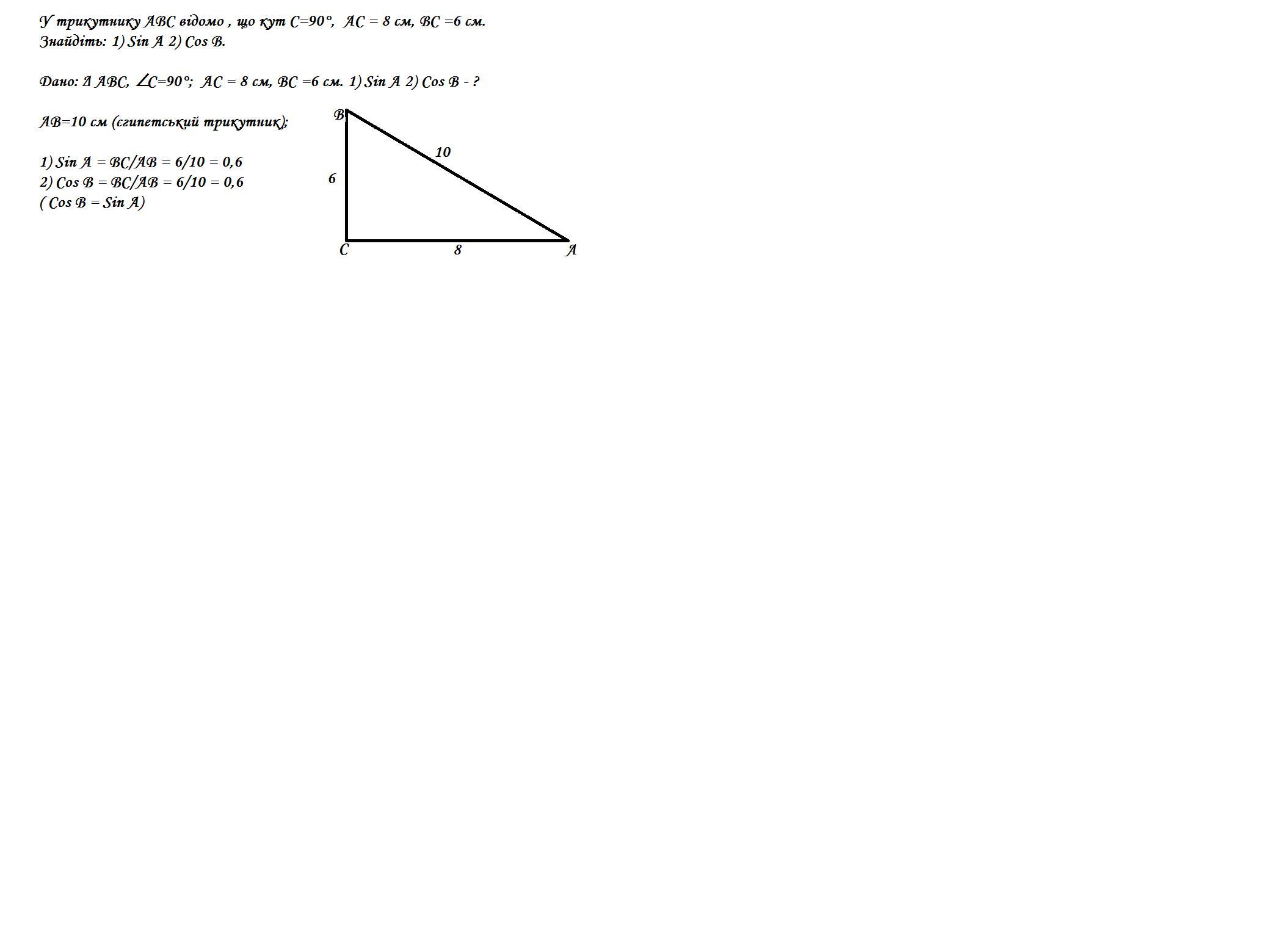 У трикутнику ABC відомо , що кут C=90° AC - 8 см, BC =6 см. Знайдіть: 1)Sin А 2)Cos B