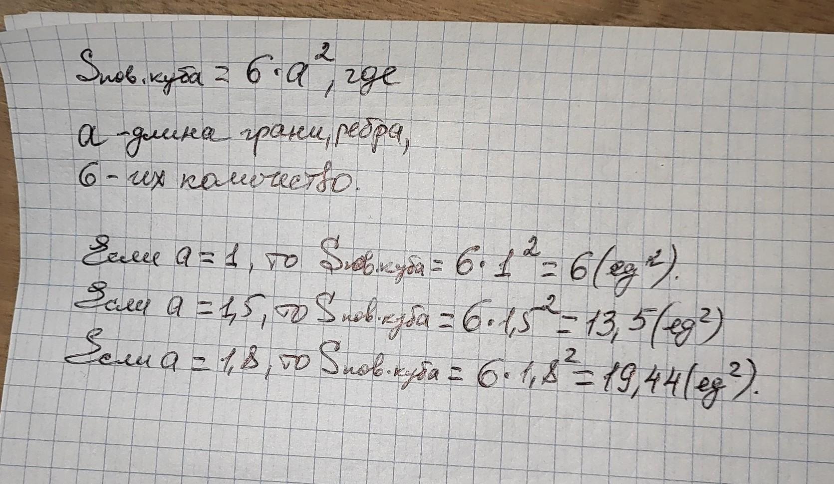 Вычисли площадь поверхности куба S см2, если его ребро равно a см. Запиши формулу, устанавливающую зависимость площади поверхности куба S от длины его ребра a. Пользуясь формулой, вычисли S, если a = 1; 1,5; 1,8.