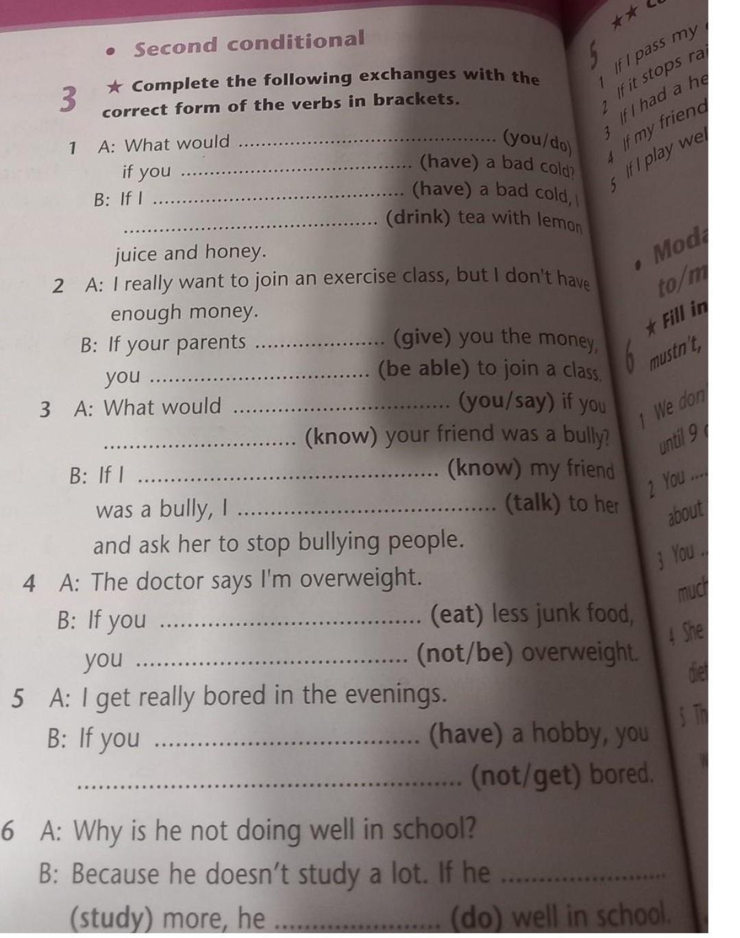 • Second conditional 3 * Complete the following exchanges with the correct form of the verbs in brackets. 1 A: What would if you B: If I juice and honey. 2 A: I really want to join an exercise class, but I don't have enough money. B: If your parents you...... 3 A: What would (you/do) ....(have) a bad cold? (have) a bad cold, I (drink) tea with lemon B: If I. (give) you the money, (be able) to join a class. (you/say) if you (know) your friend was a bully? ....... (know) my friend (talk) to her was a bully, I and ask her to stop bullying people. 4 A: The doctor says I'm overweight. B: If you (eat) less junk food, (not/be) overweight. you.... SA: I get really bored in the evenings. B: If you (have) a hobby, you ........(not/get) bored. 6 A: Why is he not doing well in school? B: Because he doesn't study a lot. If he (study) more, he ..... (do) well in school.