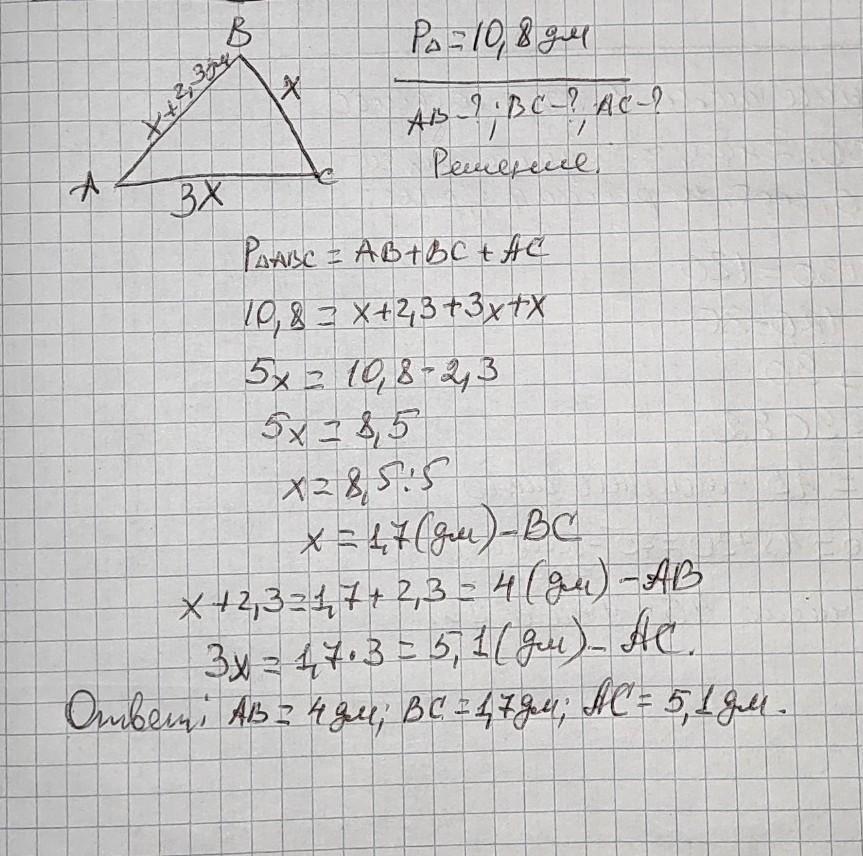 Одна сторона трикутника втричі менша за другу і на 2,3 дм менша за третю. Знайдіть сторони трикутника, якщо його периметр дорівнює 10,8дм.в.(розв'язати рівнянням)