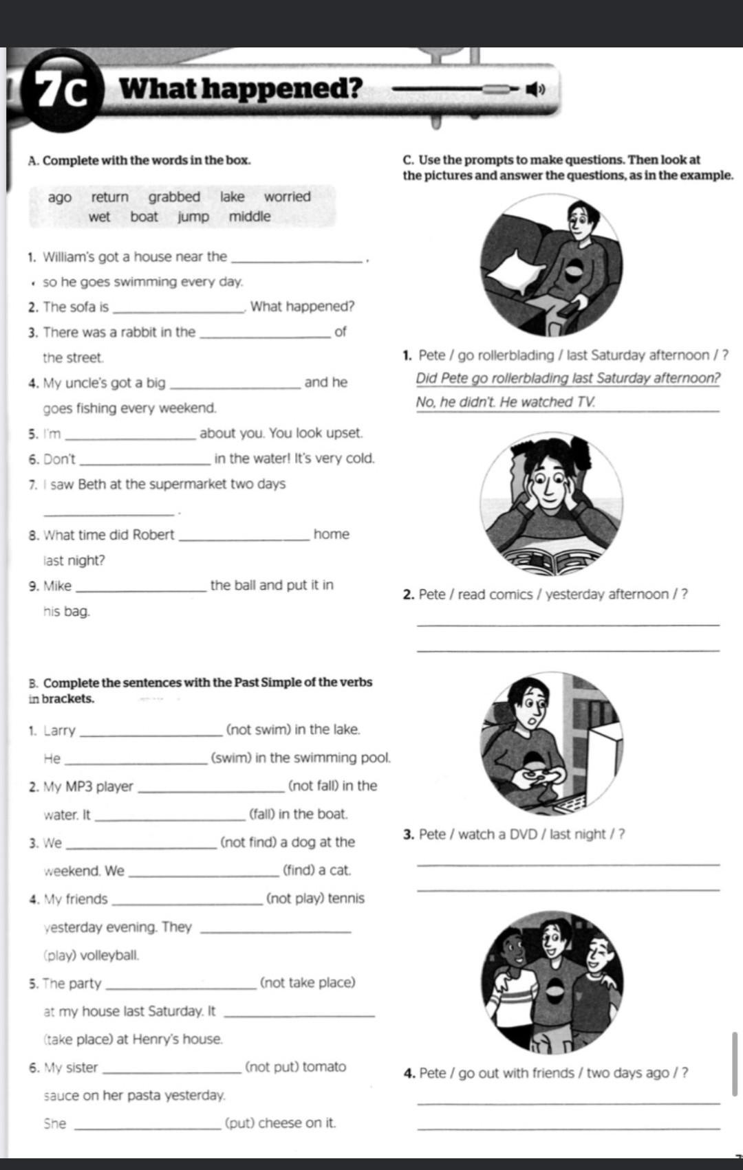 1. lake, 2. wet, 3. middle, 4. boat, 5. worried, 6. jump, 7. ago, 8. return, 9. grabbed.