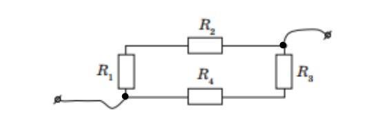 Чотири резистори R1=1Ом, R2= 2Ом, R3= 3Ом, R4= 4Ом з’єднанні за схемою, що зображена на рисунку. Визначте загальний опір, загальну силу струму та загальну напругу ділянки кола, якщо силу струму на першому резисторі дорівнює 2 А., а напруга на третьому резисторі дорівнює 3В.