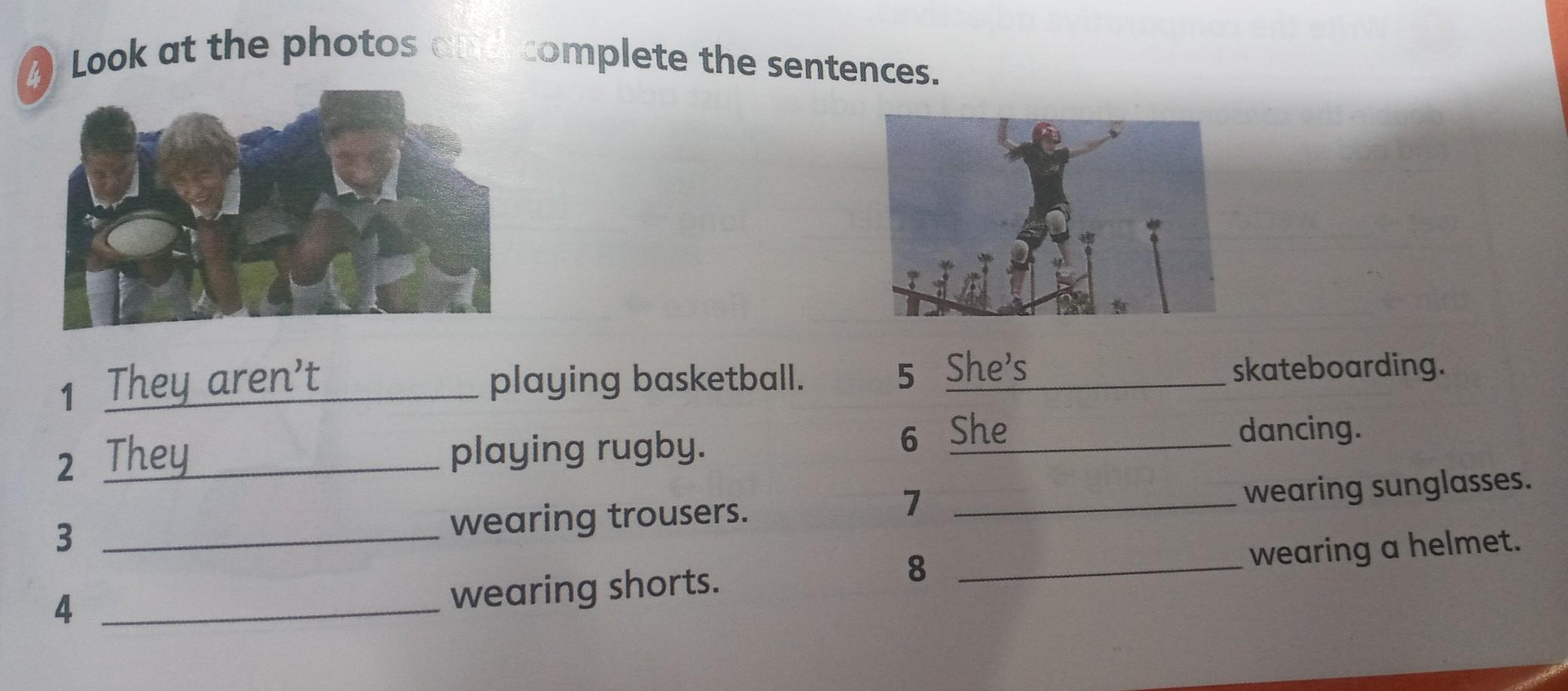 Look at the photos and complete the sentences. 1 They aren't 2 They 3 4 playing basketball. 5 She's 6 She 7 8 playing rugby. wearing trousers. wearing shorts. skateboarding. dancing. wearing sunglasse wearing a helmet...