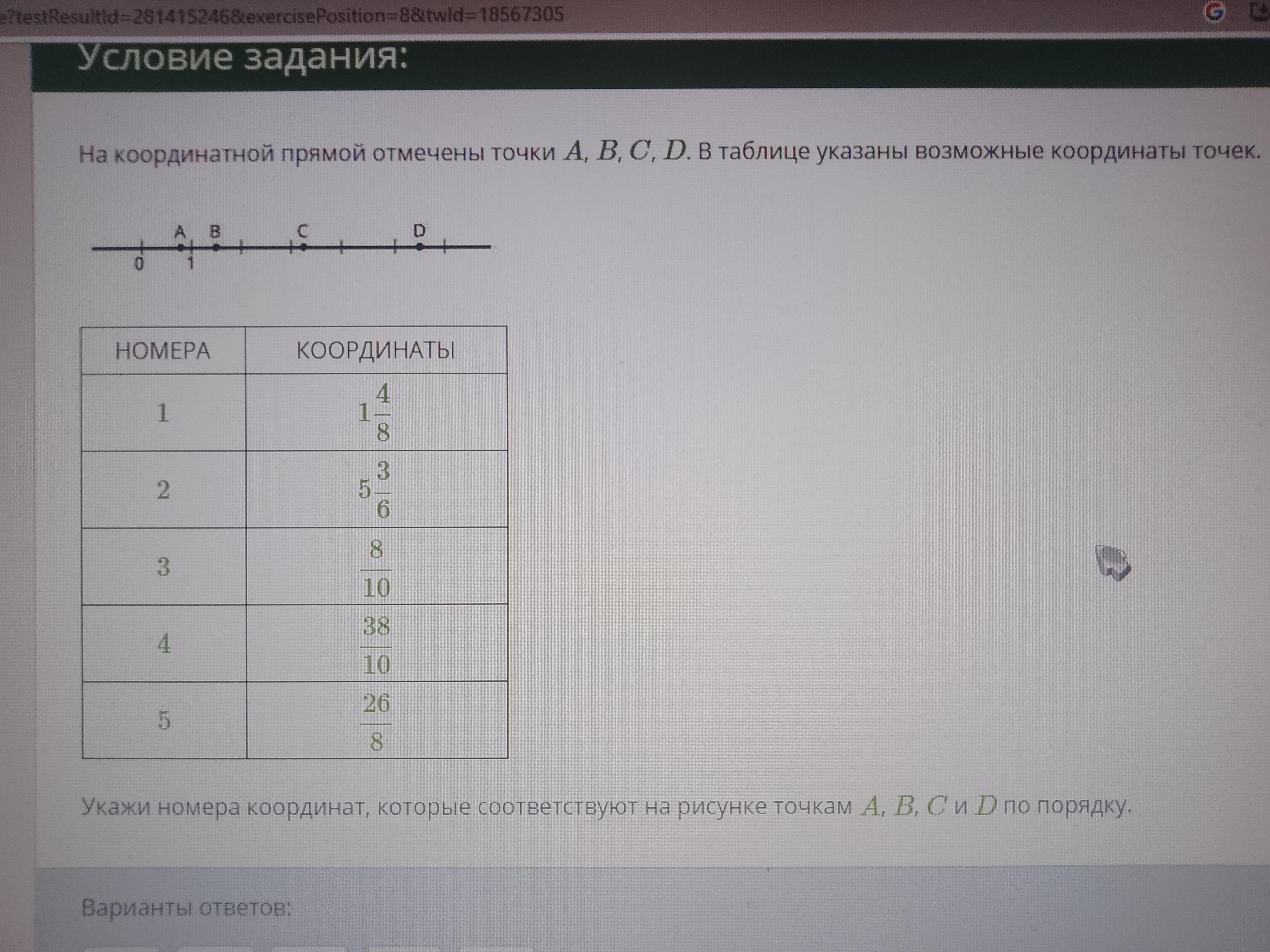 на координатной прямой отмечены точки A,B,C,D, в таблице указаны возможные координаты точек.