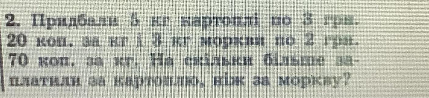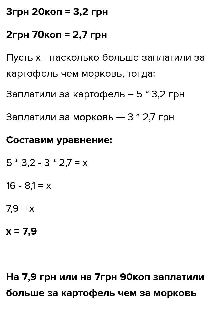 придбали 5 кг картоплі по такому3 грн.20 коп. за кг і 3 кг москви по такому2 грн. 70 коп. за кг. На скільки більше заплатила за картоплю, ніж за моркву?НЕ ПО ДІЯХ !НЕ ПО ДІЯХ!!!