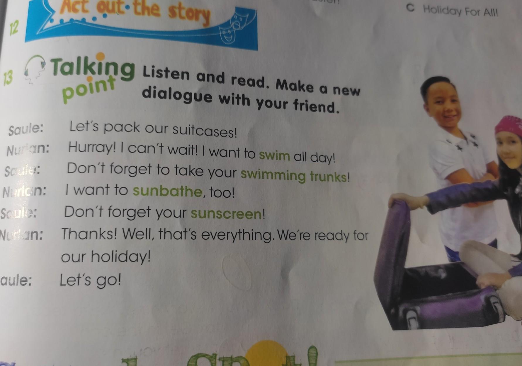 13 Saule: Nurlan: Saule: Nurlan: Saule: Nurlan: gule: Talking point Listen and read. Make a new dialogue with your friend. Let's pack our suitcases! Hurray! I can't wait! I want to swim all day! Don't forget to take your swimming trunks! I want to sunbathe, too! Don't forget your sunscreen! Thanks! Well, that's everything. We're ready for our holiday! Let's go!короче здесь надо вот это вот там