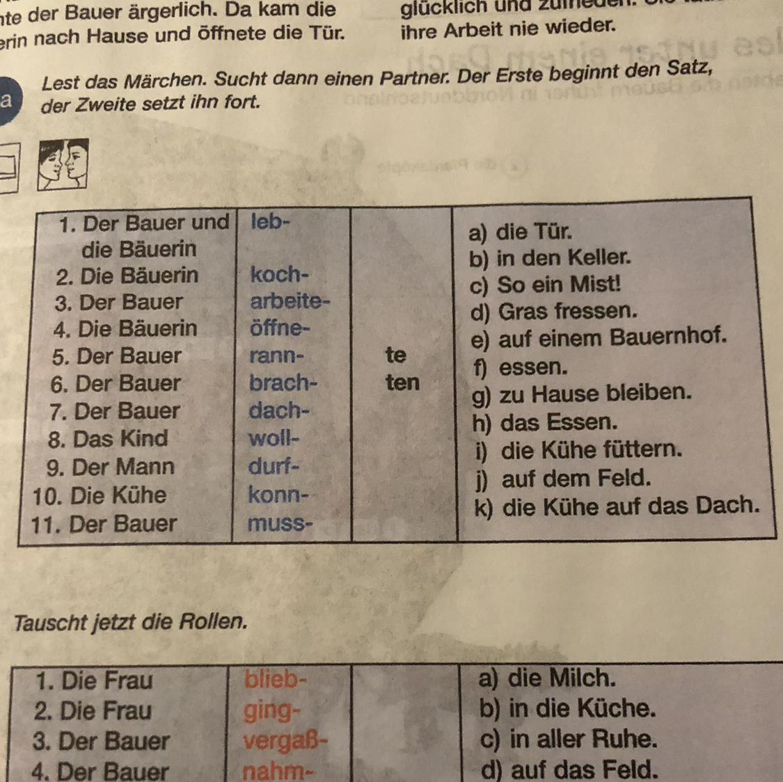 Ответ:1) Der Bauer und die Bauerin(умлаутов у меня нет) lebten auf einem Bauernhof.
