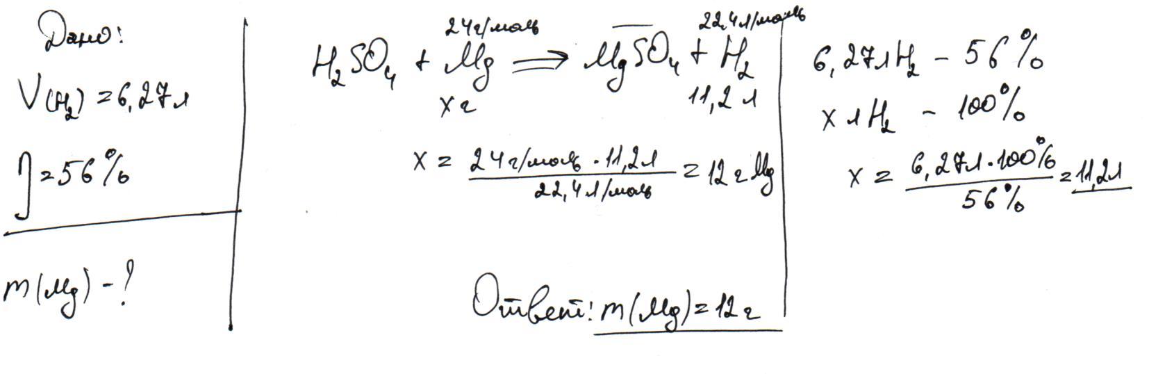 У результаті взаємодії магнію з розчином кислоти H2SO4 виділився водень об'ємом 6,27 л. Визнач масу металу (г), який потрібно використати, якщо відносний вихід водню становить 56 %
