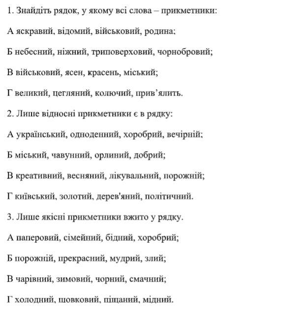 Прикметник — самостійна частина мови, що виражає ознаку предмета, граматично виявлену в категоріях роду, числа і відмінка та відповідає на питання який? яка? яке? які? чий? чия? чиє? чиї?