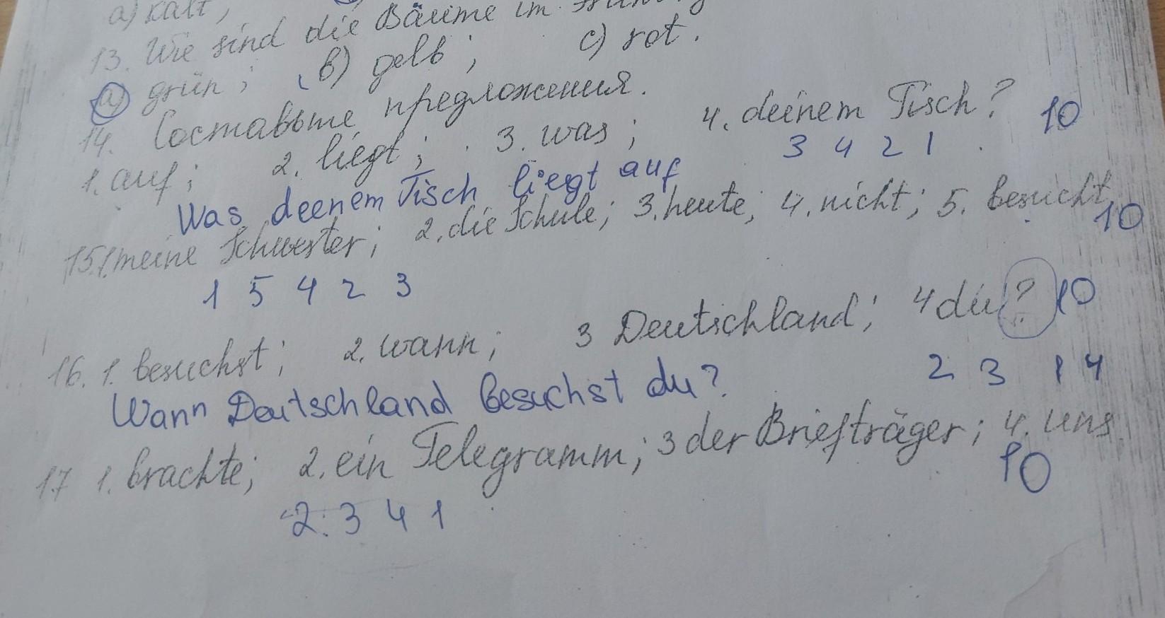 1) auf / liegt / was / deinem tisch ? (вопросительное предложение)