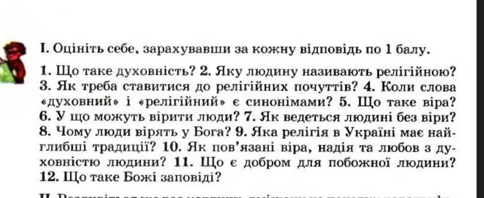 1. Оцініть себе, зарахувавши за кожну відповідь по 1 балу. 1. Що таке духовність? 2. Яку людину називають релігійною? 3. Як треба ставитися до релігійних почуттів? 4. Коли слова «духовний» і «релігійний» є синонімами? 5. Що таке віра? 6. У що можуть вiрити люди? 7. Як ведеться людині без вiри? 8. Чому люди вірять у Бога? 9. Яка релігія в Україні має най- глибші традиції? 10. Як пов'язанi вiра, надія та любов з ду- ховністю людини? 11. Що є добром для побожної людини, 12. Що таке Божі заповіді?