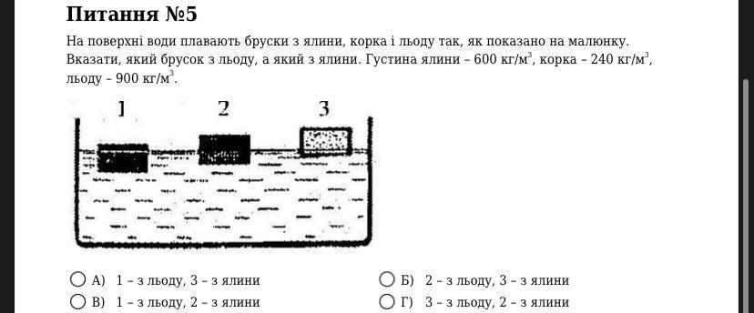 Брусок з льоду має густину 900 кг/м³, тому це буде брусок C. Брусок з ялини має густину 600 кг/м³, тому це буде брусок А. Брусок Б має густину 240 кг/м³, отже, це кора.