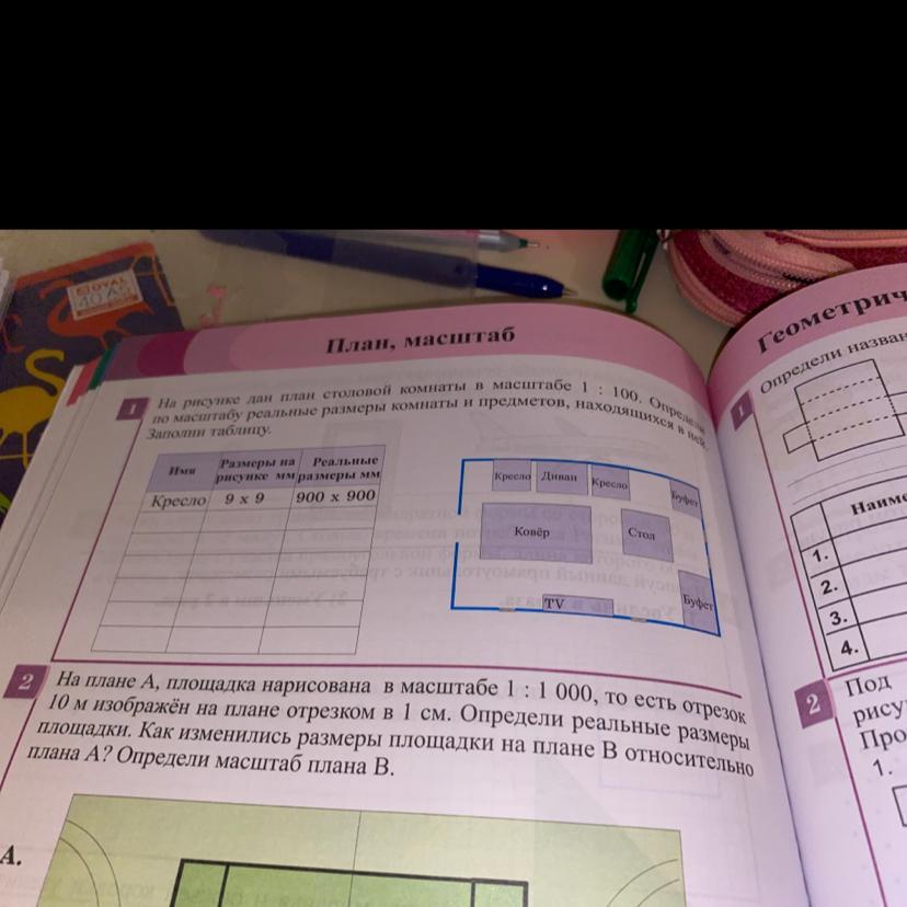 На рисунке Дан план столовой комнаты в масштабе 1:100. Определи по масштабу реальные размеры комнаты и предметов , находящихся в ней . Заполни таблицу п