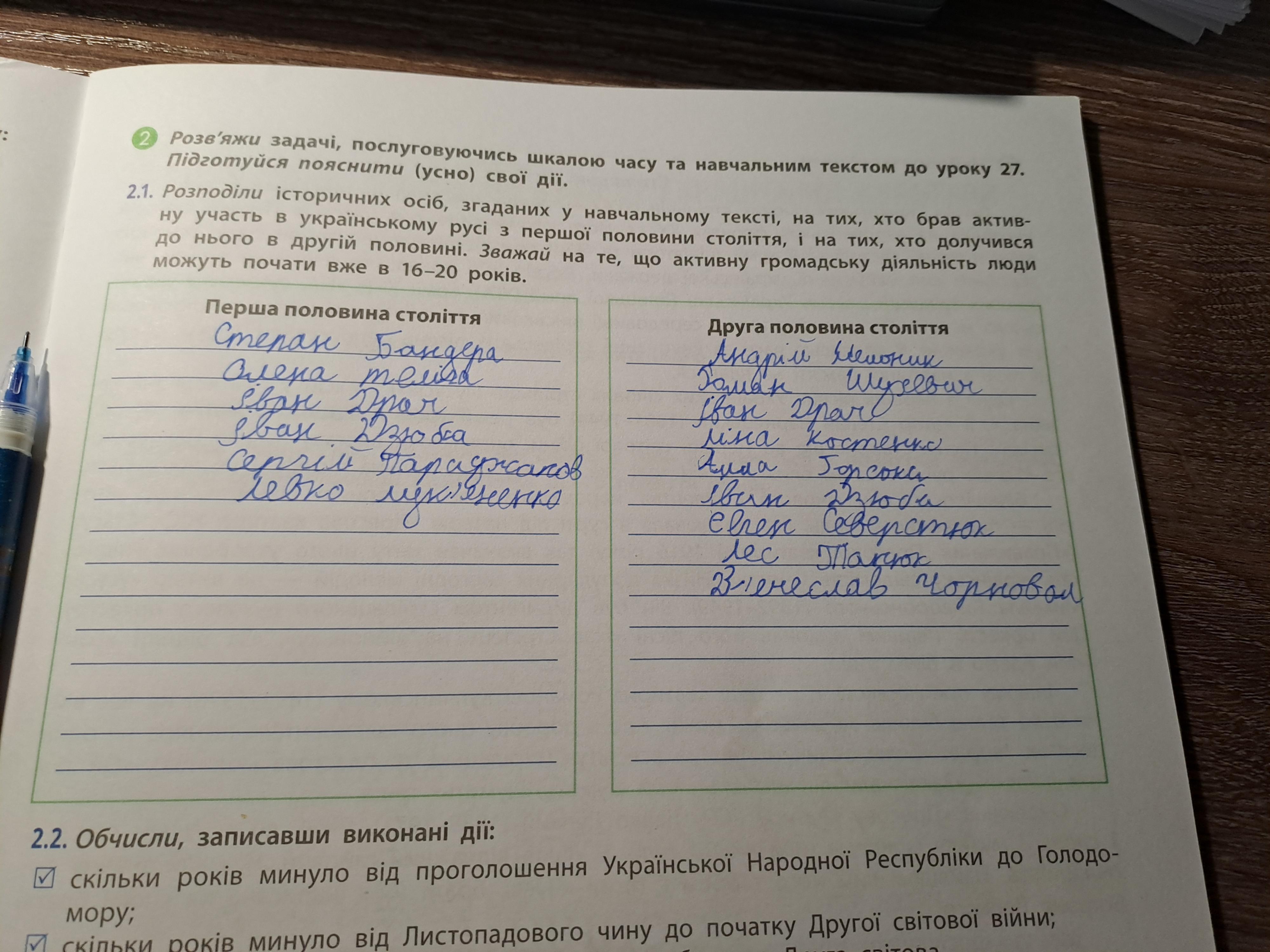 2 Розв'яжи задачі, послуговуючись шкалою часу та навчальним текстом до уроку 27. Підготуйся пояснити (усно) свої дії. 2.1. Розподiли історичних осіб, згаданих у навчальному тексті, на тих, хто брав актив- ну участь в українському русі з першої половини століття, і на тих, хто долучився до нього в другій половині. Зважай на те, що активну громадську діяльність люди можуть почати вже в 16-20 років. Перша половина століття Друга половина століття